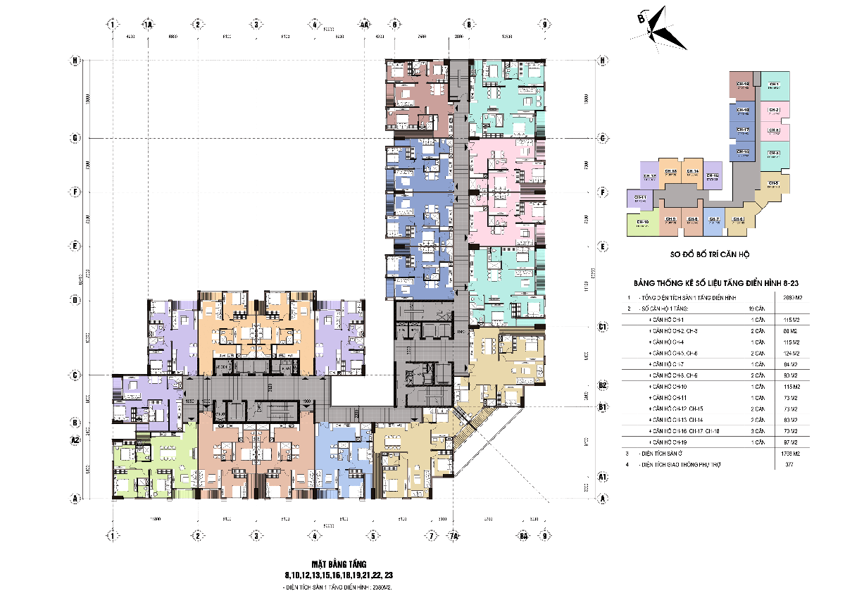 - Một sàn gồm 19 căn hộ: Diện tích 65 – 118 m2