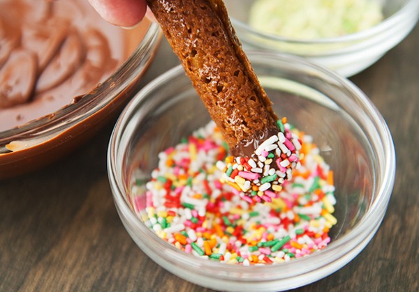 Với các loại bánh không dính mà muốn tạo lớp kẹo trang trí, bạn có thể nhúng qua socola chảy hoặc mật ong để tạo độ dính trước rồi mới lăn qua kẹo trang trí.