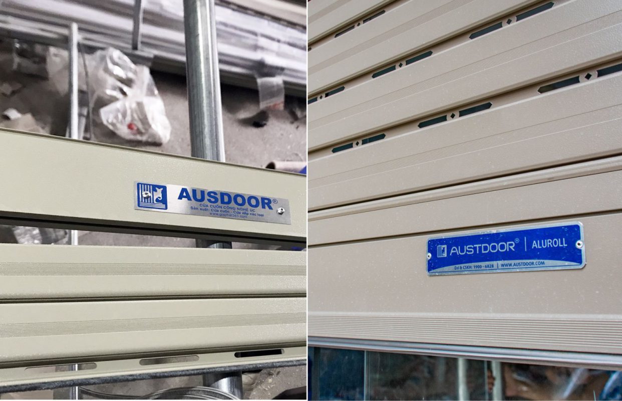 Cửa cuốn nhái Ausdoor (bên trái) chỉ thiếu chữ “T” so với thương hiệu chính hãng Austdoor (bên phải)